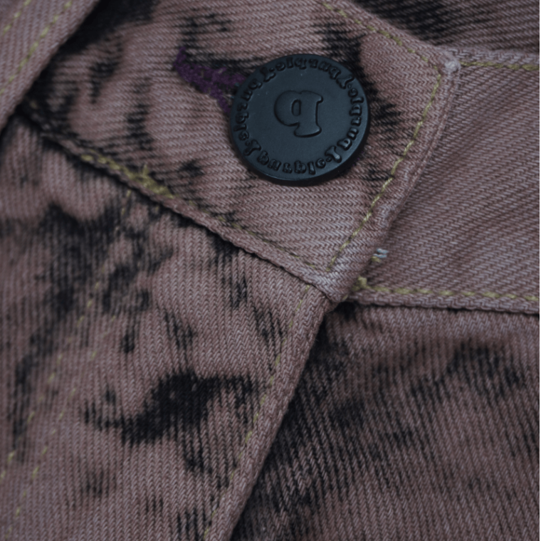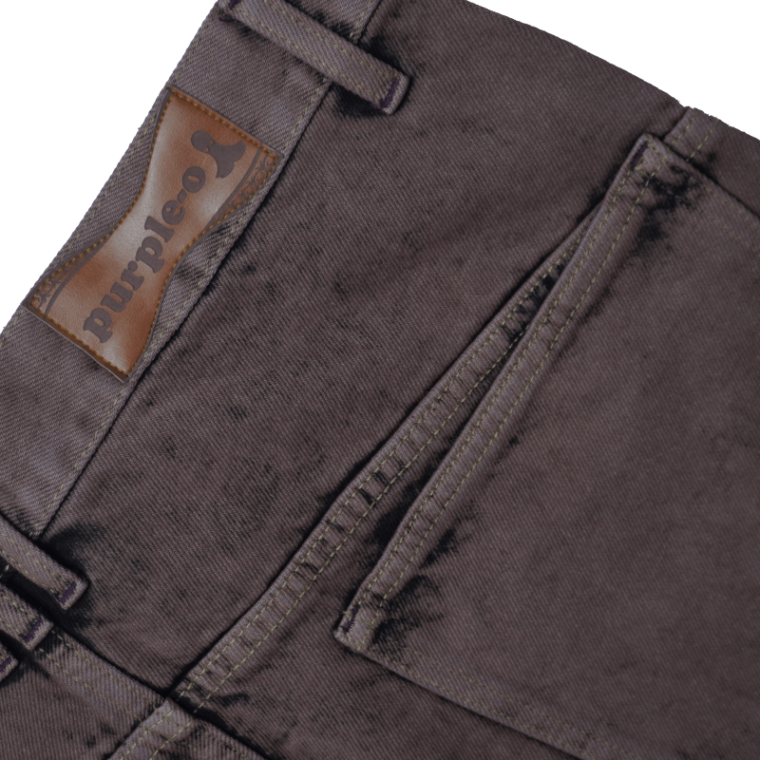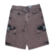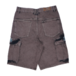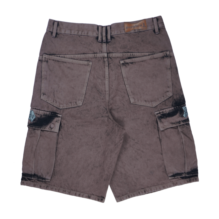 Bermuda cargo modelagem baggy com bolsos bem amplos com botões de pressão e palas invertidas, zipper YKK, jeans pesado 12oz com lavagens exclusivas e travetes contrastantes em roxo