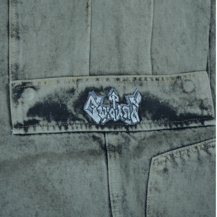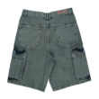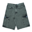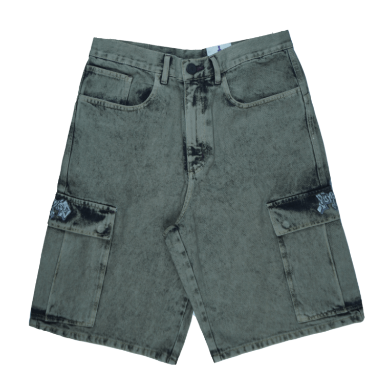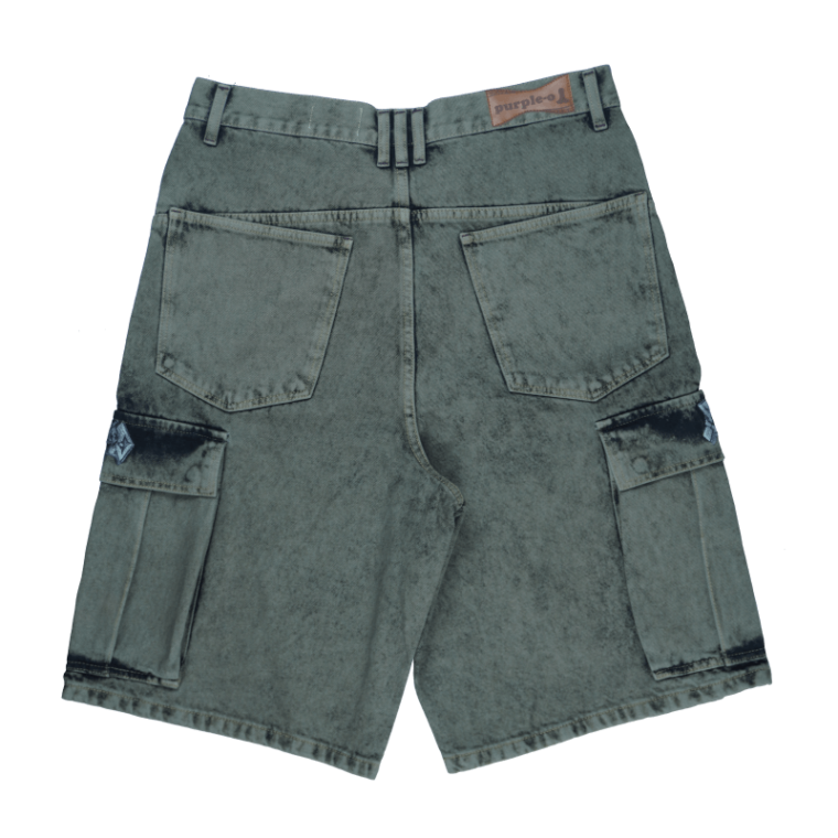 Bermuda cargo modelagem baggy com bolsos bem amplos com botões de pressão e palas invertidas, zipper YKK, jeans pesado 12oz com lavagens exclusivas e travetes contrastantes em roxo